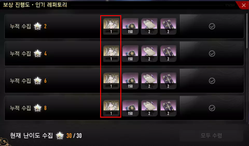 ‘인기 레퍼토리’부터 보상으로 받을 수 있습니다.