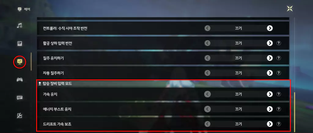 스크롤을 최대한 내려 [탑승 장비 입력 모드]를 찾아줍니다.