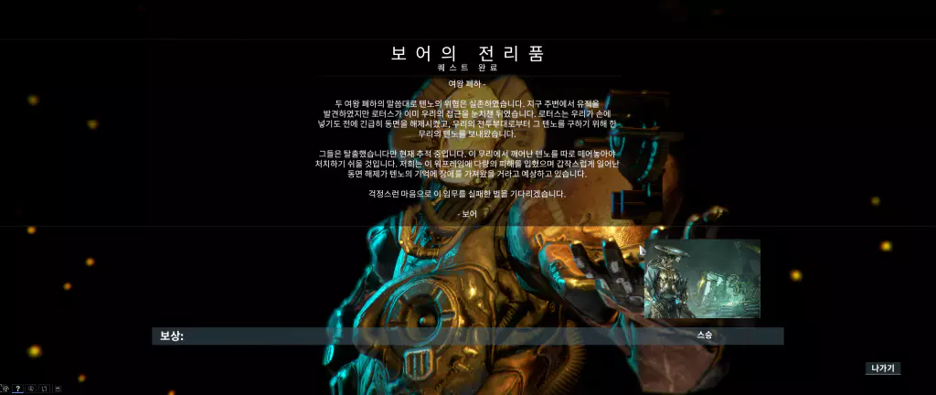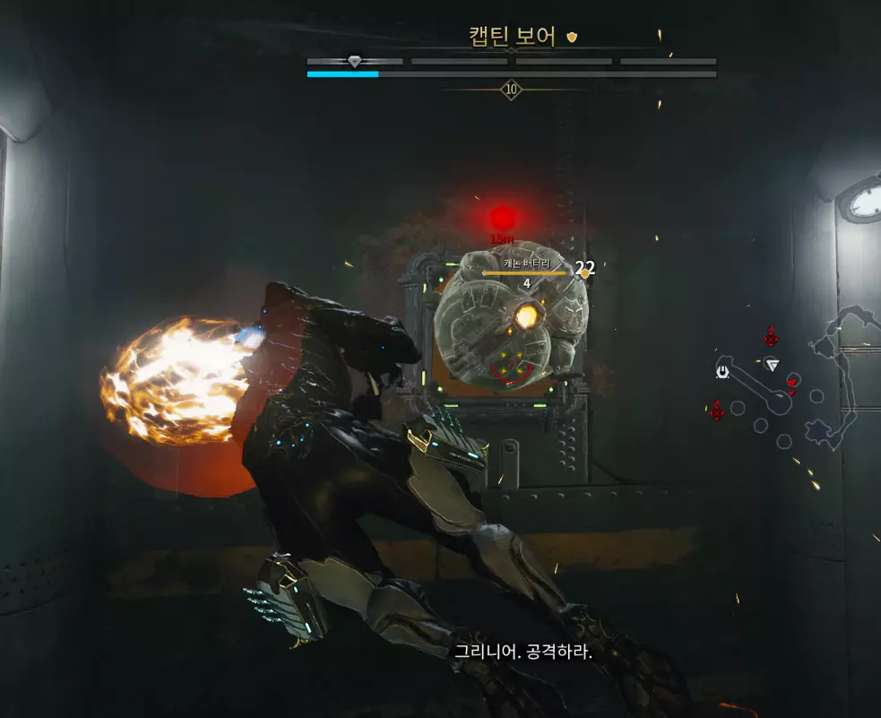 워프레임의 메인 퀘스트인 [보어의 전리품] 마지막 퀘스트이자 보스전, 캡틴 보어와의 대결입니다.